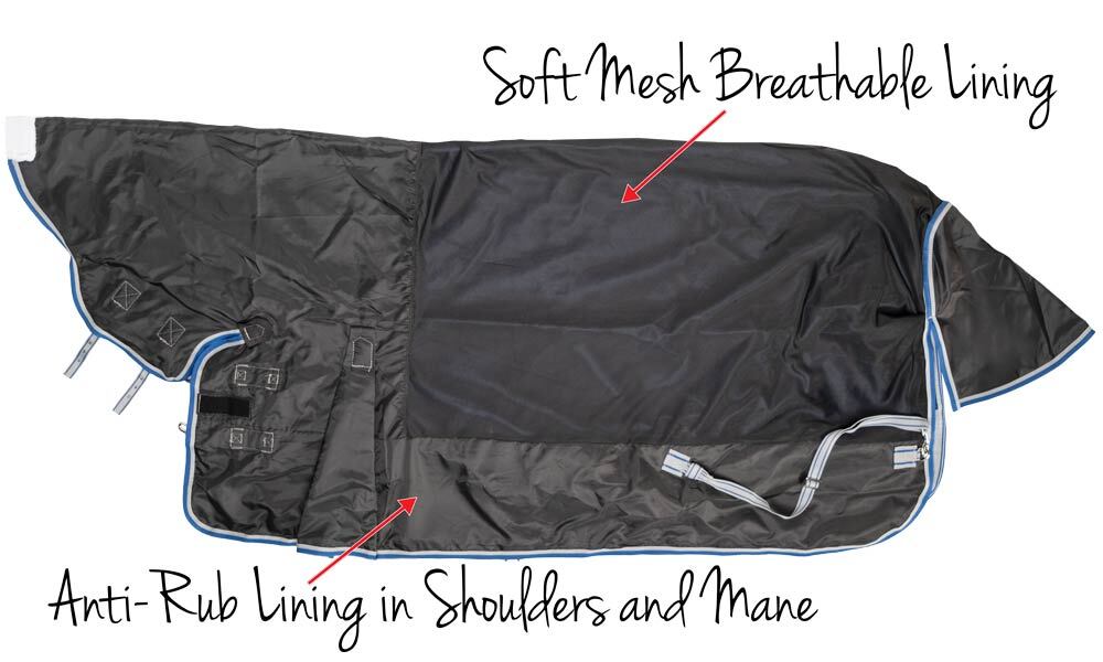 - Anti-Rub Linings – shoulder, mane, and tail flap areas protected