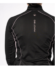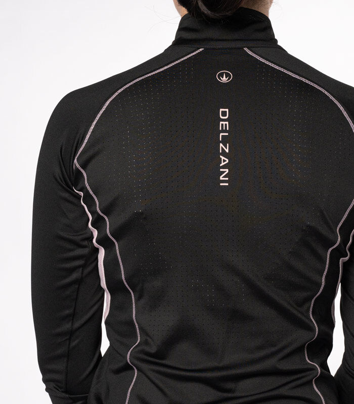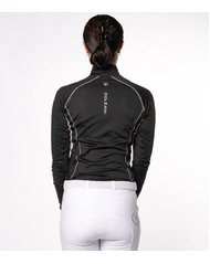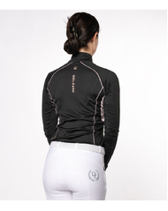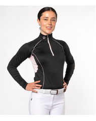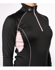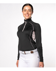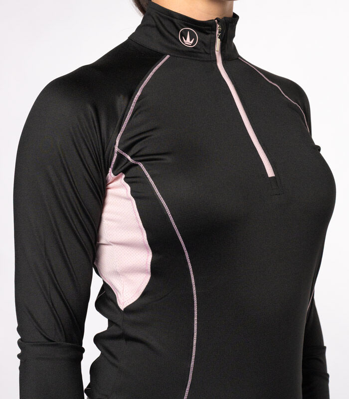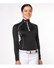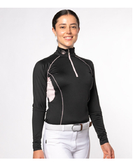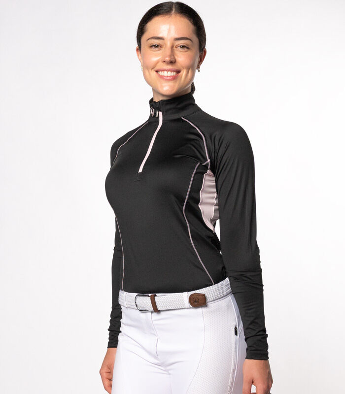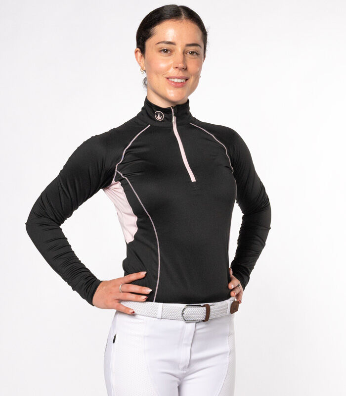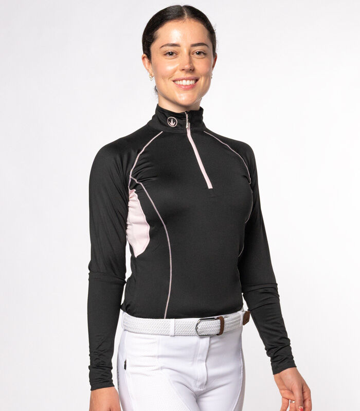 The 'Dixie-Air' long-sleeve ladies' technical horse riding shirt, in stunning black and blush, is designed for year-round wear and is ideal for competition, training, and everyday casual horse riding.