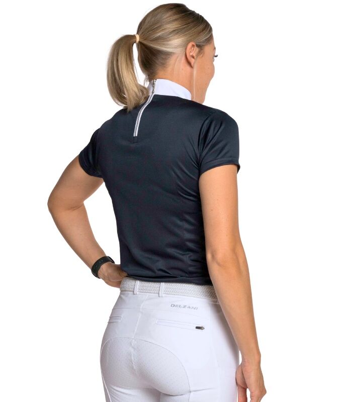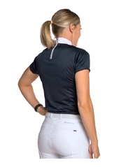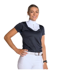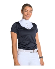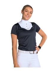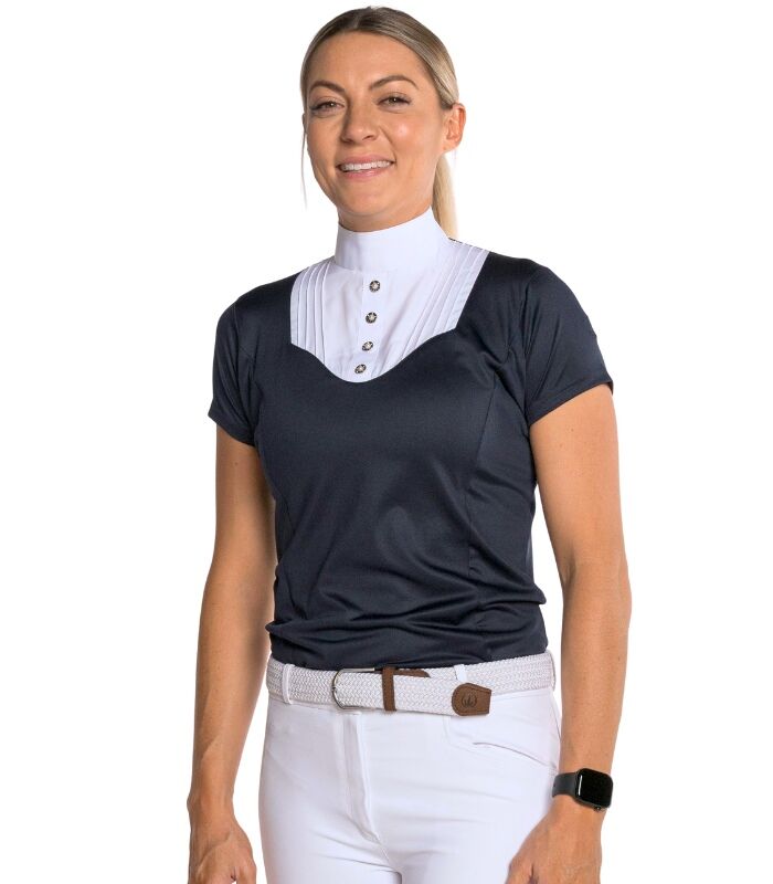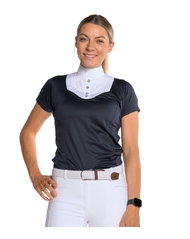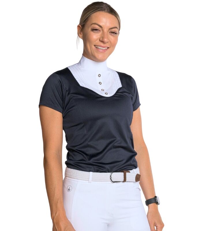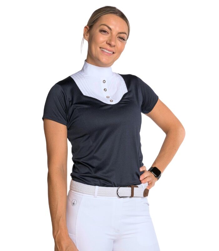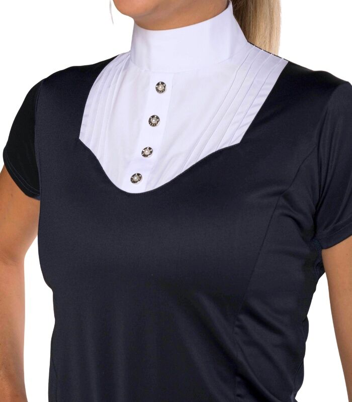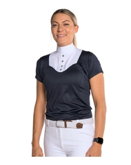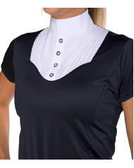 The 'Rose' dressage competition shirt offers a beautiful built-in front show bib embellished with pearl buttons, providing the serious competition rider with a traditional, yet luxurious look.